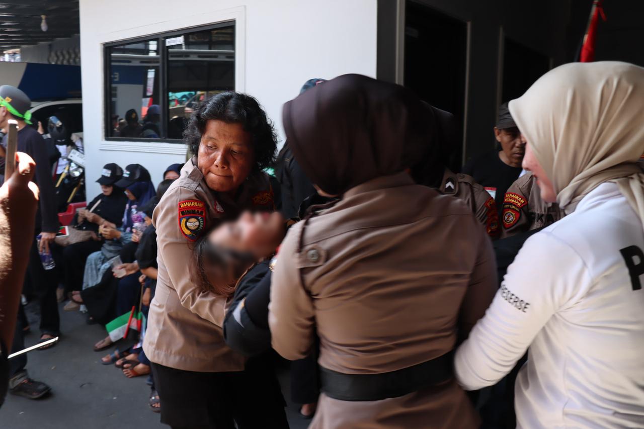 Bandar Lampung – Sejumlah Polisi Wanita membantu mengevakuasi dan memberikan pertolongan pertama kepada sejumlah peserta aksi Bela Palestina jilid 3 yang jatuh pingsan di Tugu Adipura, Kota Bandar Lampung, Sabtu (19/4/2025).