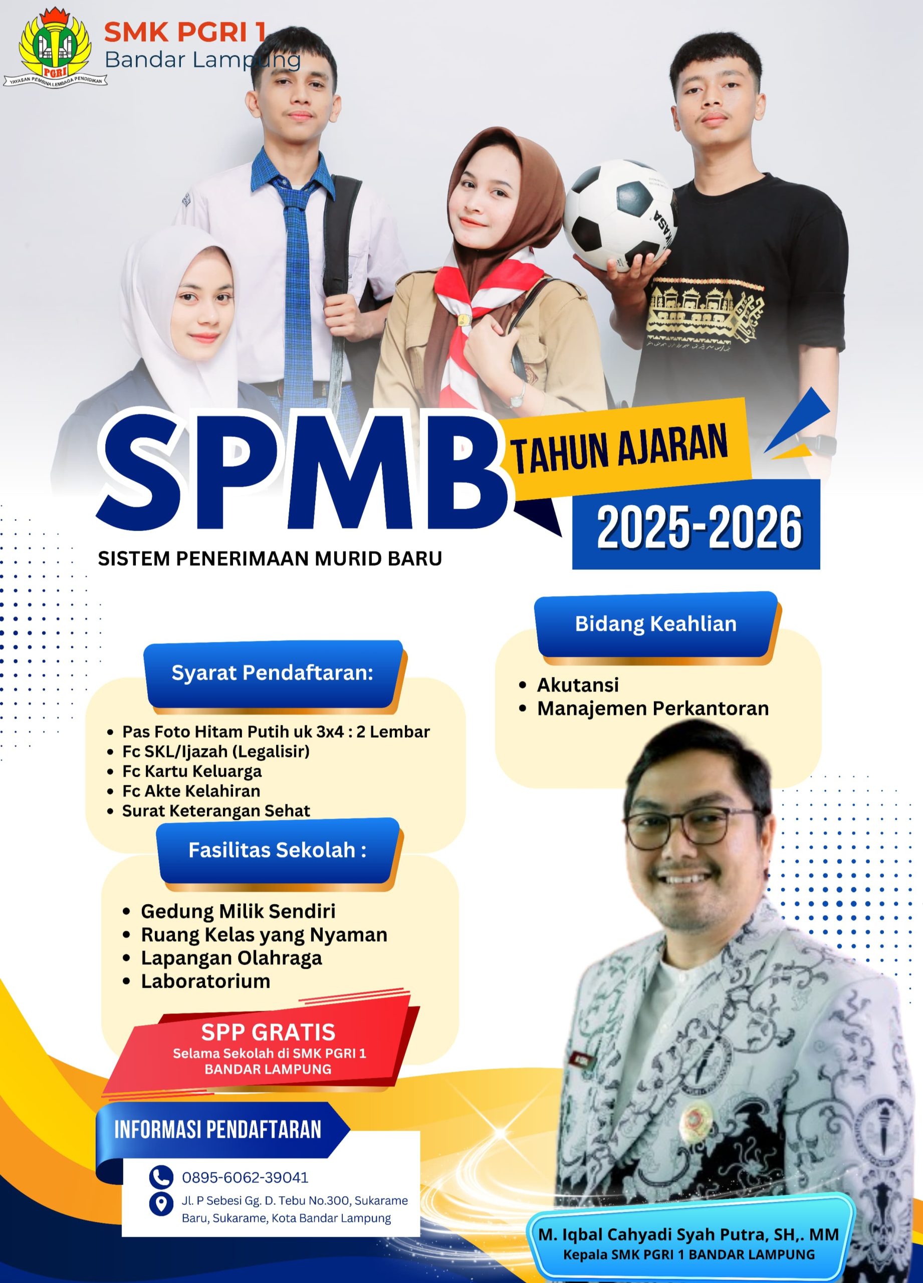 Bandar Lampung -SMK PGRI 1 Bandar lampung membuka pendaftaran siswa baru untuk tahun ajaran baru. Menurut Kepala Sekolah SMK PGRI 1 Bandar lampung, M.Iqbal Cahyadi syah putra , selaku kepala sekolah “Kami sangat antusias menyambut siswa baru di tahun ajaran ini. Kami memiliki program-program keahlian yang dapat membantu siswa mengembangkan potensi mereka dan menjadi generasi unggul.”