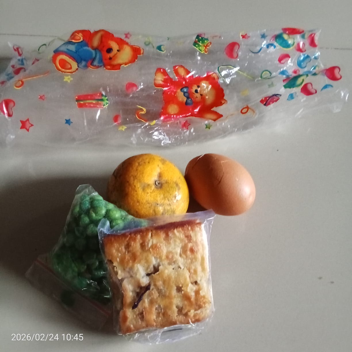 Untuk diketahui menu makanan bergizi gratis pada hari Selasa tanggal 24/2/2026 hanya 1 butir telur rebus,1 bungkus kacang polong,1 bungkus roti gabing,dan 1 buah jeruk yang berukuran kecil menu makan tersebut dibagikan kepada murid kelas 1 sampai kelas 6 di SD negri 1 mekar sari.